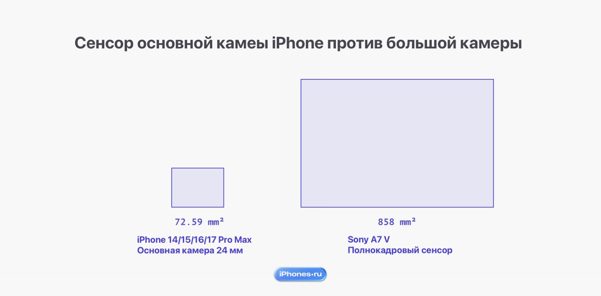 То есть сенсор камеры iPhone 17 Pro Max аж в 11 раз меньше, чем у камеры для профессионалов.
