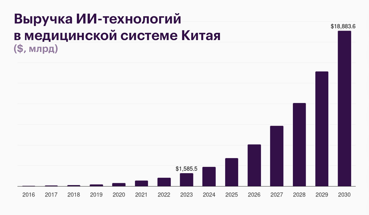 За счёт подобных изменений сектор искусственного интеллекта в здравоохранении Китая будет расти более чем на 40% ежегодно до 2030 года и достигнет к тому моменту выручки в 18,9 миллиарда долларов (1,5 триллиона рублей).