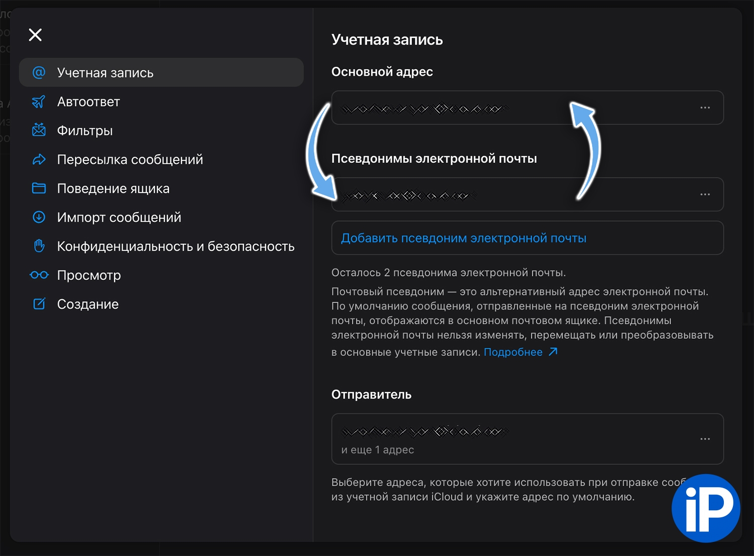 Когда замените старую почту на новую по инструкции выше и перезайдете в веб-версию iCloud, увидите, что основной идентификатор и псевдоним поменяются местами.