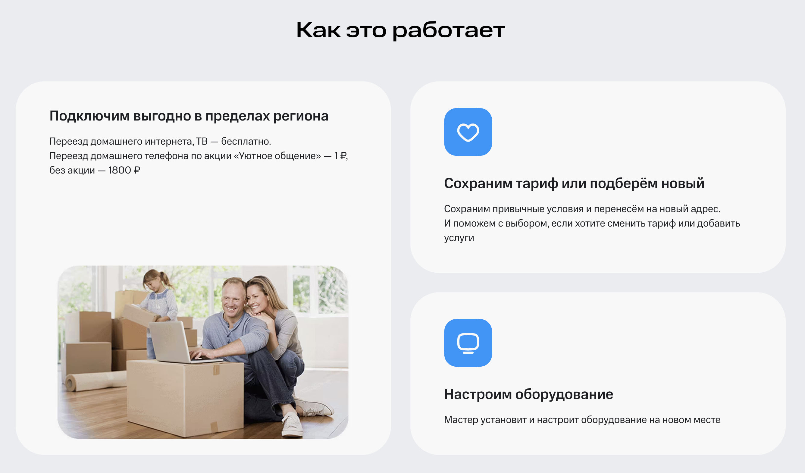 Если наш клиент переезжает в пределах Московского региона, ему достаточно сообщить новый адрес, чтобы мы проверили доступность подключения интернета в новой квартире. Если такая техническая возможность существует, то на новом месте уже с самых первых дней клиент сможет пользоваться привычным домашним интернетом, интерактивным ТВ и телефоном, сохранив прежние условия тарифа.Оборудование из старой квартиры необходимо привезти с собой, чтобы в назначенное время наш специалист подключил и настроил все услуги. При этом договор перезаключать не надо. У клиента сохраняется весь набор услуг по прежнему тарифу, лицевой счет и даже номер домашнего телефона, формат получения счета и оплаты. В общем, всё то, к чему он привык.