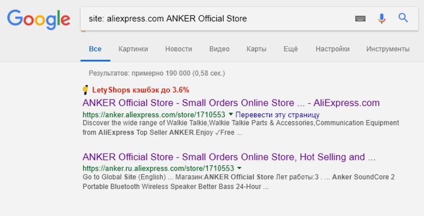 Если знаете название проверенного магазина, но не можете найти его на AiExpress, на помощь придет Google.