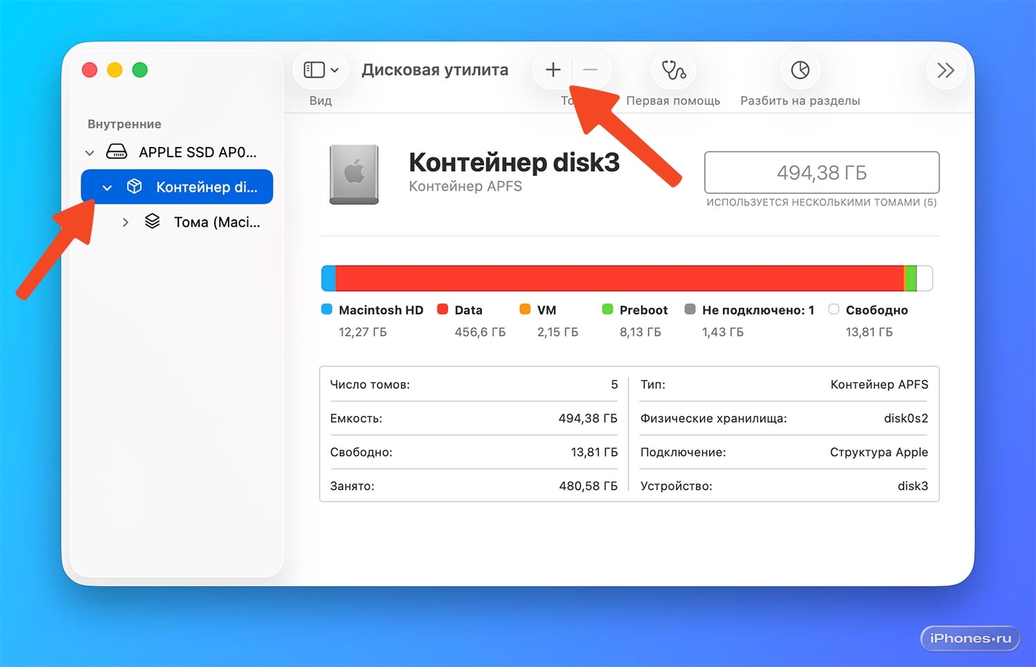 4. Создайте новый том. Для этого выделите главный контейнер в боковом меню утилиты и нажмите “+” в верхней панели.