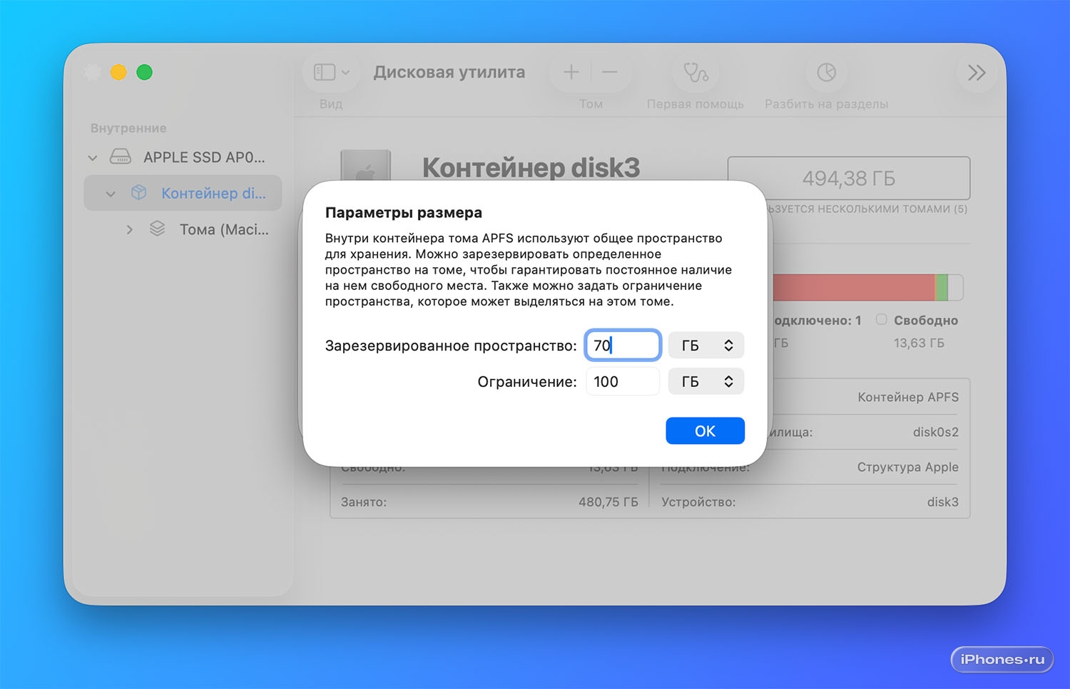 Например, можно указать 70 ГБ – минимально необходимое пространство, чтобы установить в него другую версию macOS, несколько приложении и с комфортом работать.