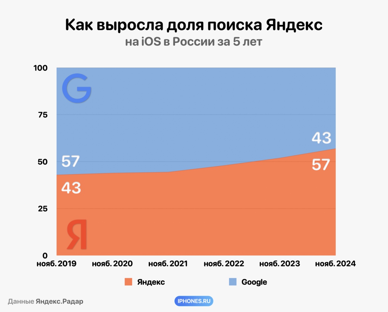 В ноябре 2024 года ситуация противоположная. Всего 43% россиян с iPhone ищут информацию в Google. 57% запросов обрабатывает Яндекс.
