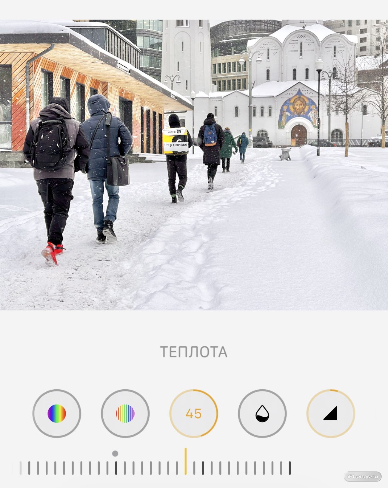 Основной задачей будет подкрутить цвет фотографии в параметре Теплота и усилить яркость снега.