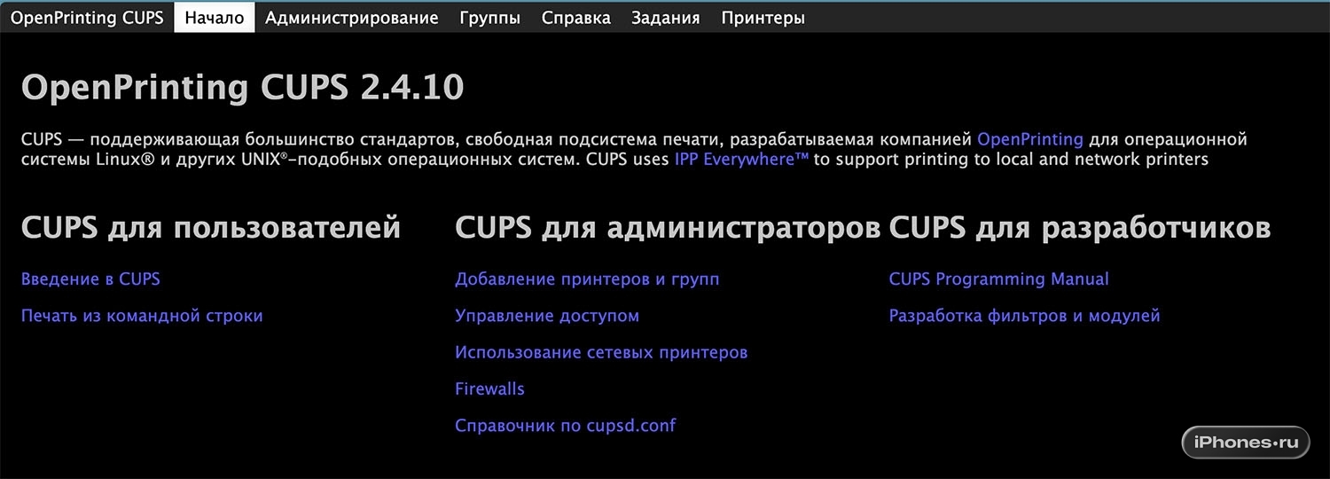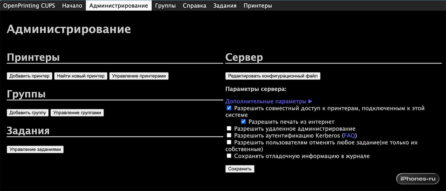 7. Теперь можно открывать браузер и управлять службой в веб-интерфейсе. Для этого перейдите по адресу: https://IP-адрес:631/admin