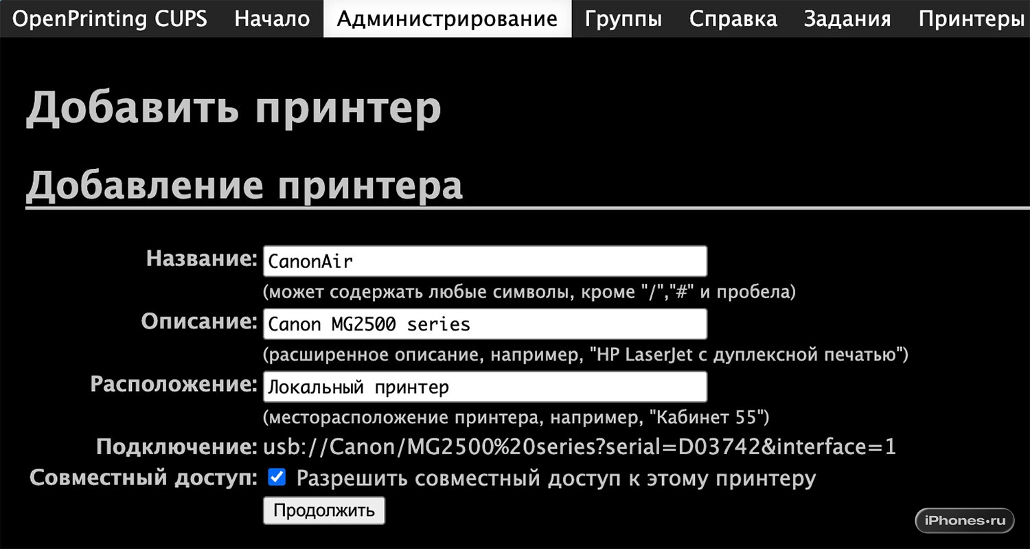 9. Выберите подключенный принтер, укажите его название в сети и обязательно поставьте флаг Разрешить совместный доступ.