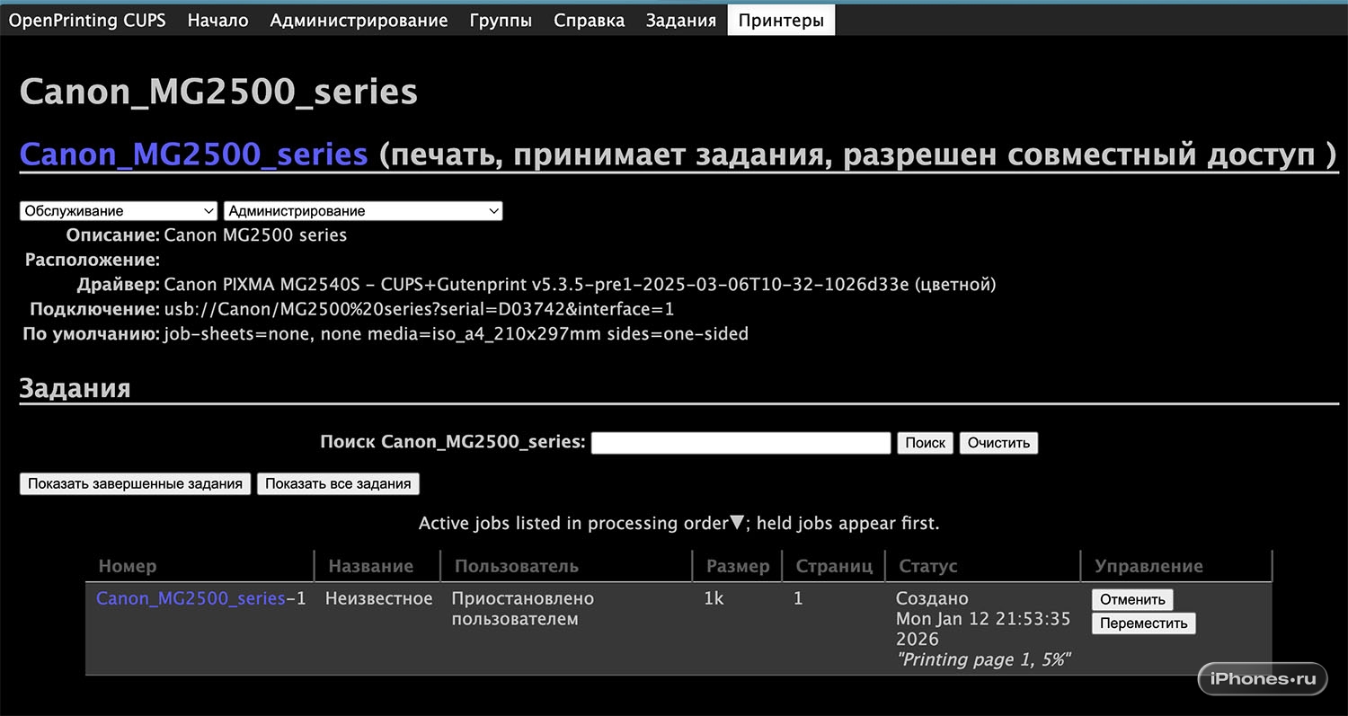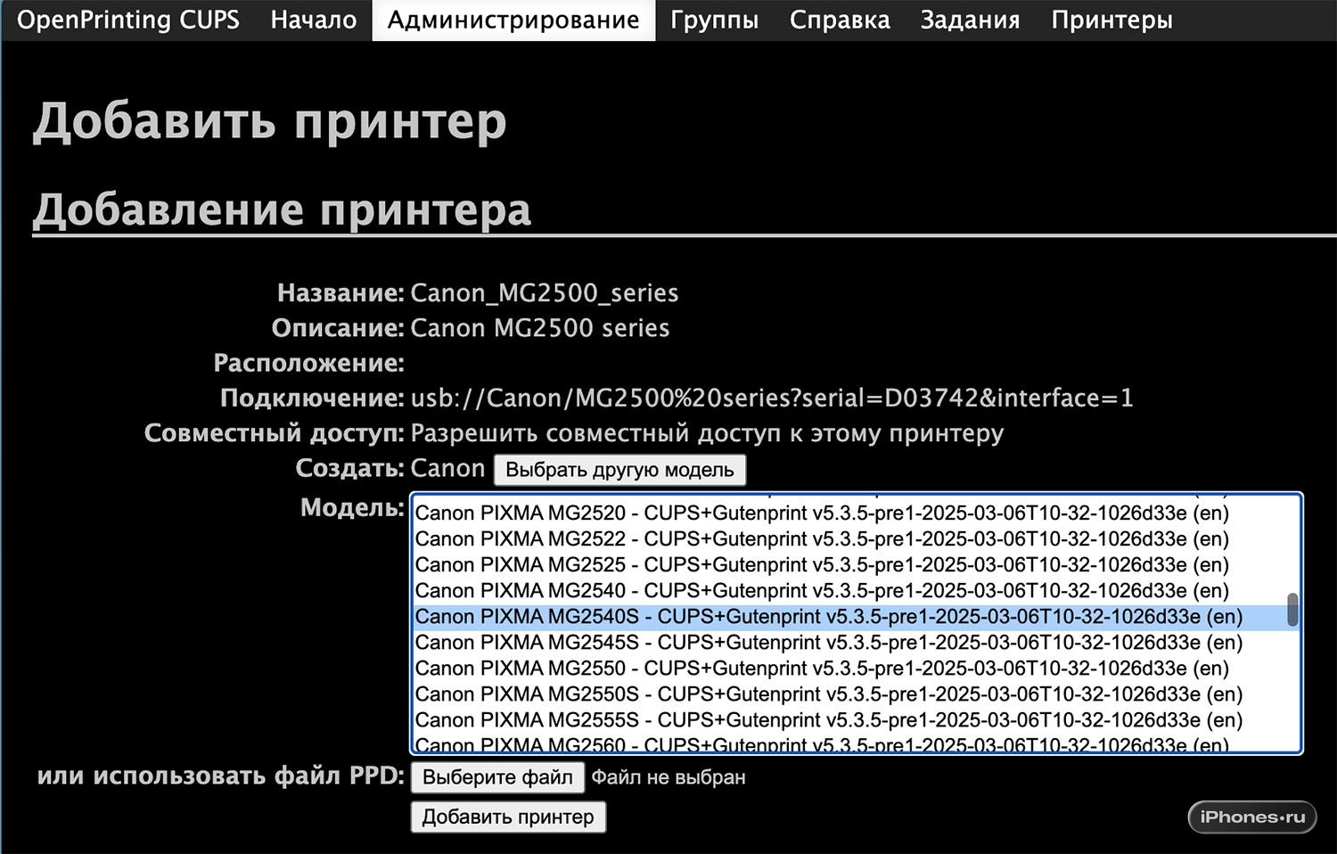 Изначально в базе не было драйверов для принтеров Canon, но после 5 минут общения с ChatGPT я получил нужную последовательность действий: