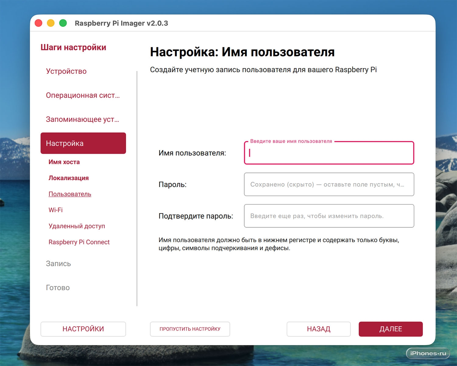 6. На следующем шаге введите имя пользователя и пароль. Это долгожданное изменение в Raspberry Pi Imager позволяет сменить дефолтные параметры и сделать сервер более защищенным.