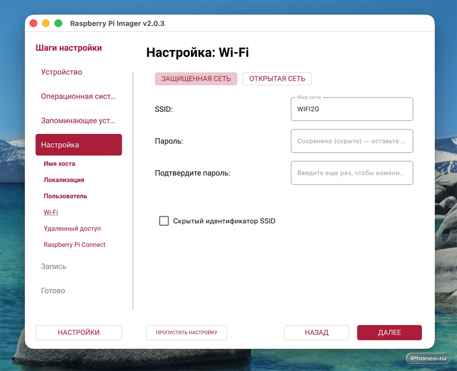 7. Дальше еще одна полезная фишка – данные вашей Wi-Fi сети. Раньше для этого приходилось подключать “малинку” к роутеру по проводу для первоначальной настройки или вручную добавлять текстовый файл в специальном формате на карту памяти. Сейчас достаточно ввести данные в менеджер установки и устройство само подключится к сети.