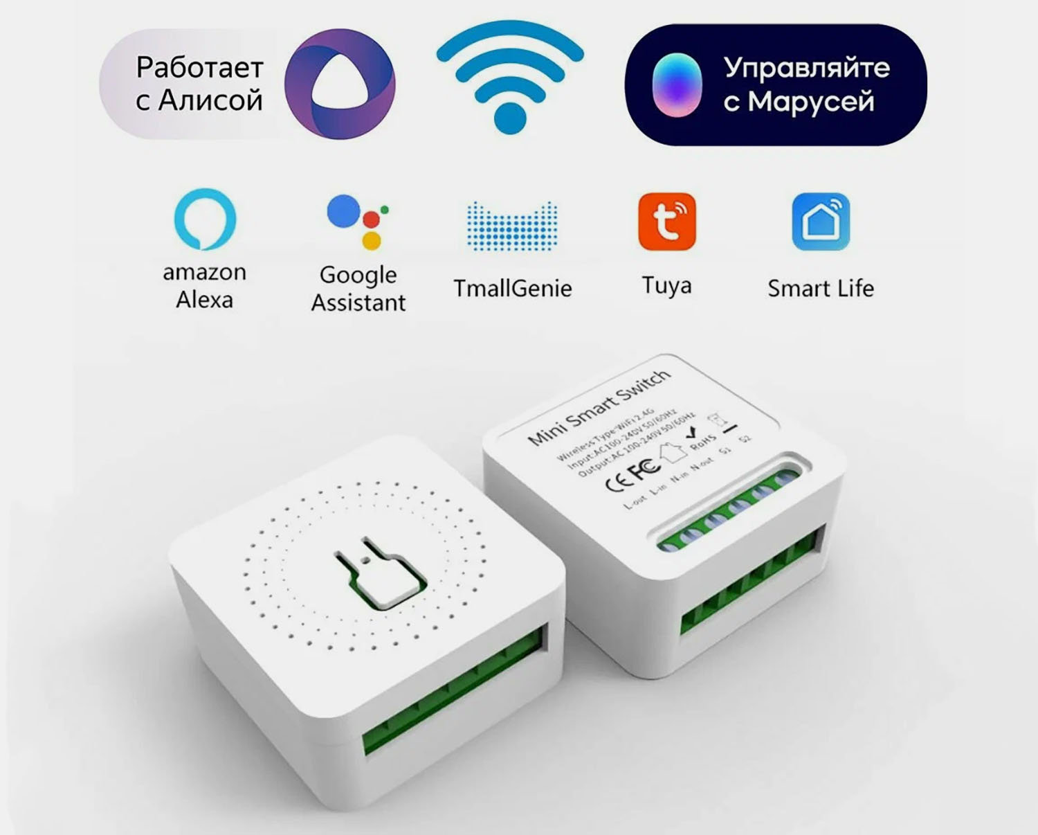 Реле – это небольшая коробочка, которая подает и отключает питание. Если встроить ее в цепь с устройством, можно управлять им удаленно, при помощи голосовой команды или настроить сценарии автоматизации.