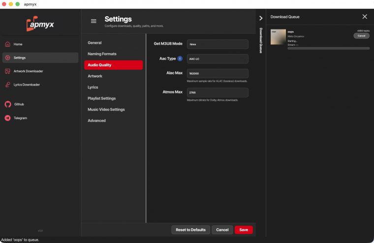 Вставьте его в настройки apmyx. - Вставьте ссылку на ваш альбом, плейлист или конкретный трек в главное окно программы.