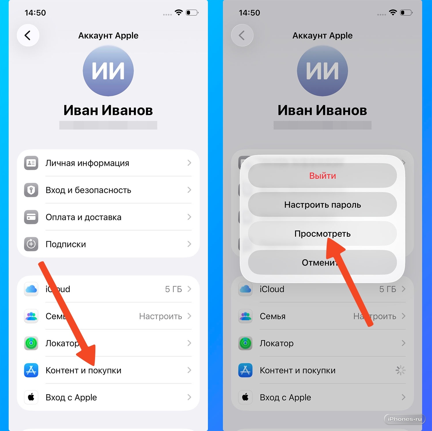 2. Откройте меню Контент и покупки, затем нажмите кнопку Просмотреть.