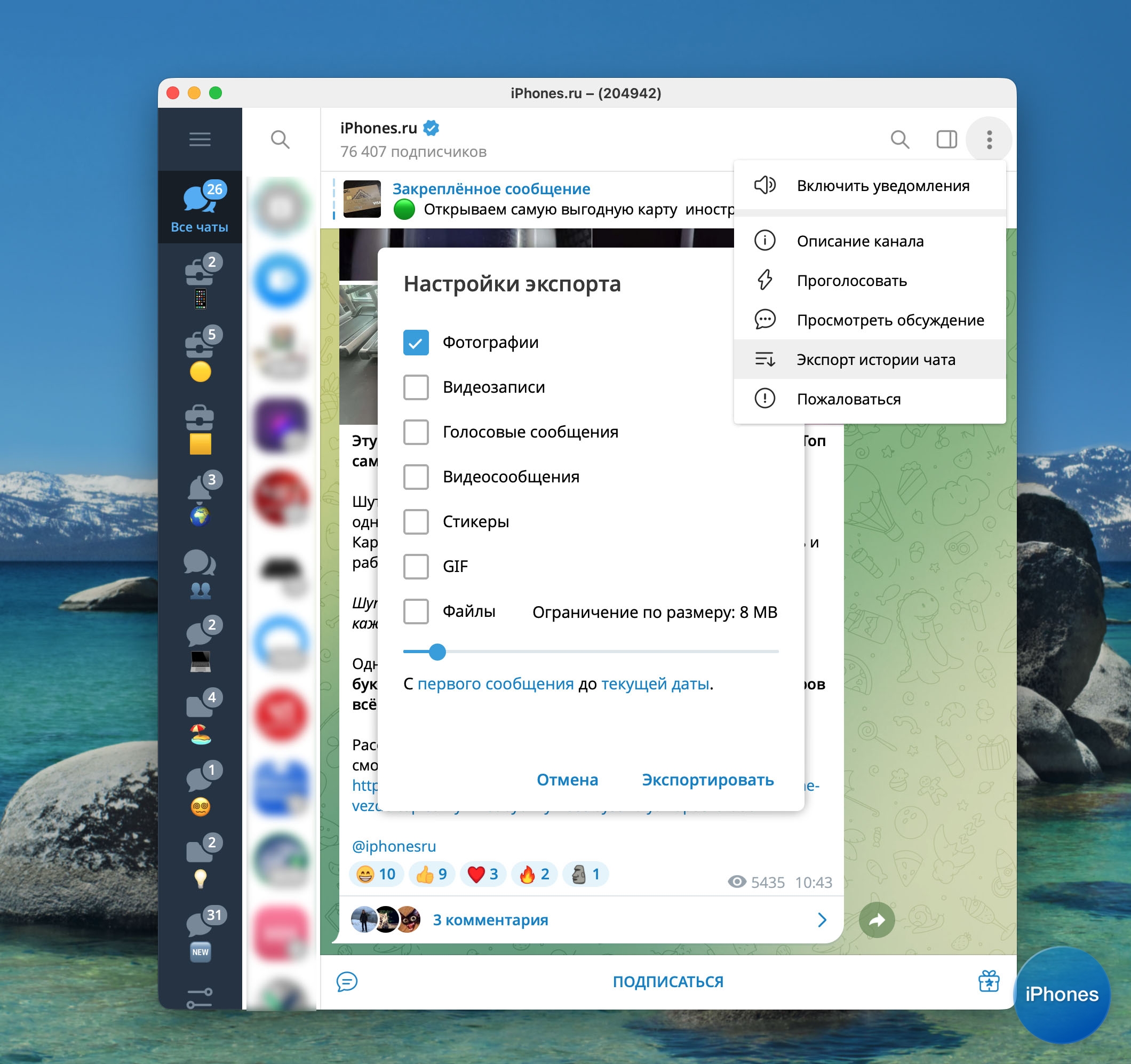 Если нужно сохранить только данные, а не саму переписку, можно экспортировать файлы прямо из меню мессенджера.
