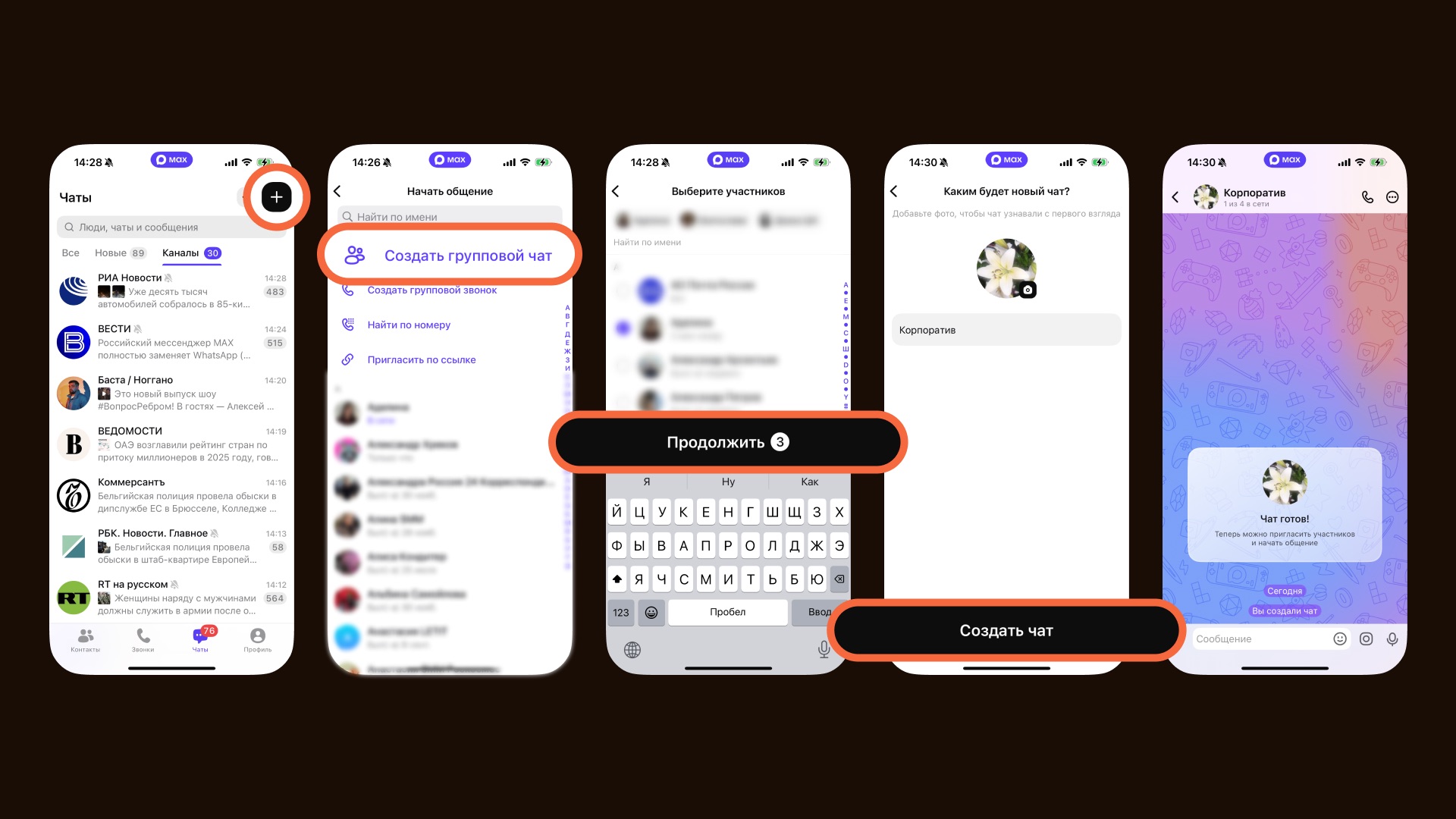 Групповой чат в MAX создаётся почти одинаково в мобильном приложении, десктопе и браузерной версии. Отличается только расположение элементов на экране, но логика везде одна и та же.