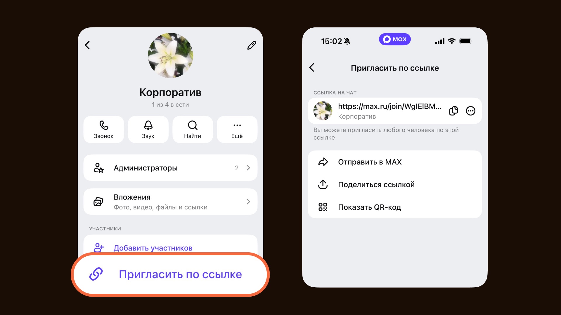 Когда групповой чат уже создан, встаёт задача перевести туда людей из других мессенджеров. В MAX есть два удобных способа: по ссылке/QR-коду и через прямое добавление по контактам.