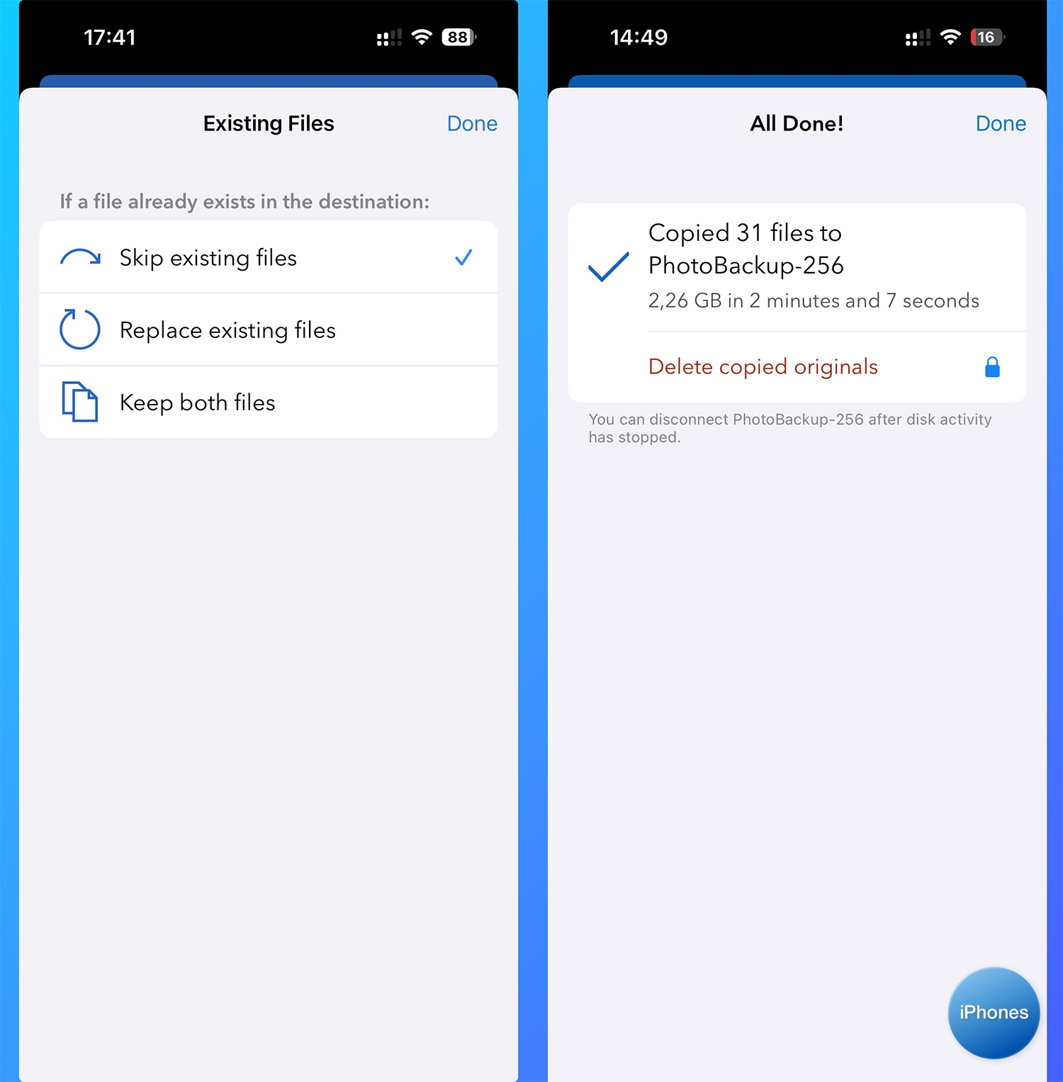 ➖ нет статуса копирования, нельзя сворачивать приложение.