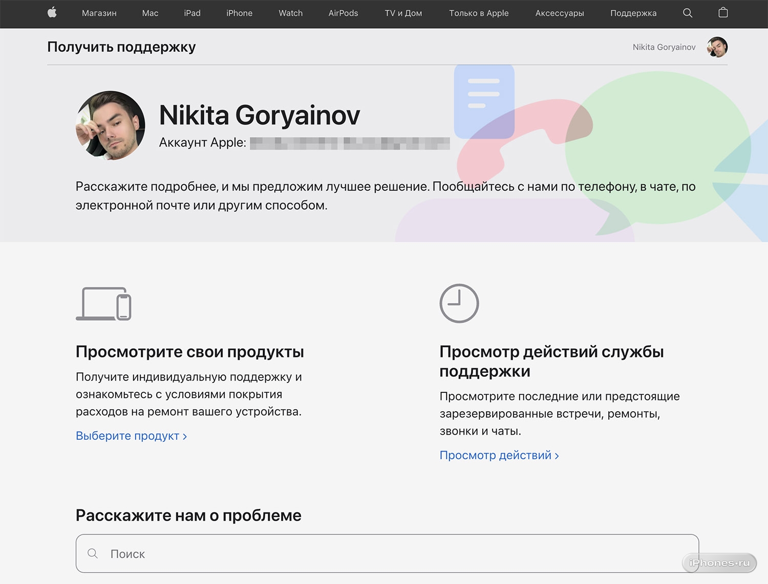 Если ваш iPhone или iPad включается и имеет доступ в сеть, это первое, куда стоит пойти. Приложение автоматически подтягивает все ваши устройства, привязанные к Apple ID, и сразу предлагает выбор проблем по категориям.