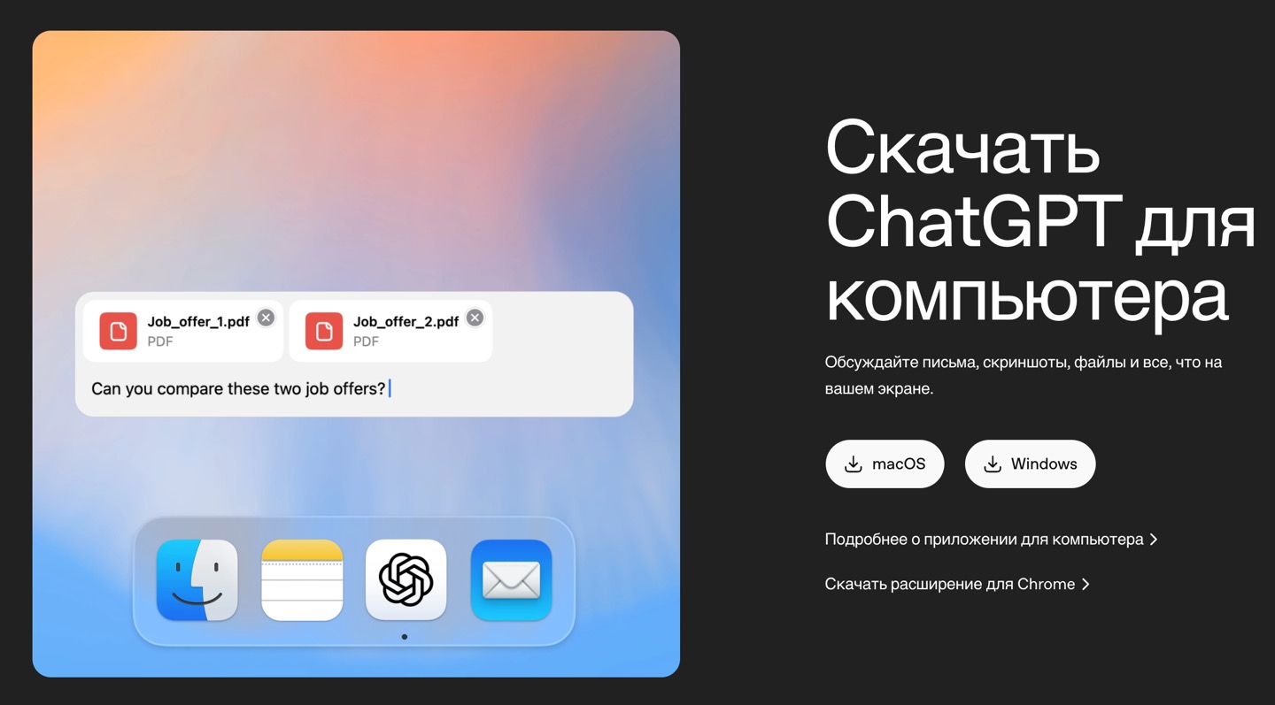 Приложения ChatGPT для Windows и macOS можно скачать прямо с сайта OpenAI.