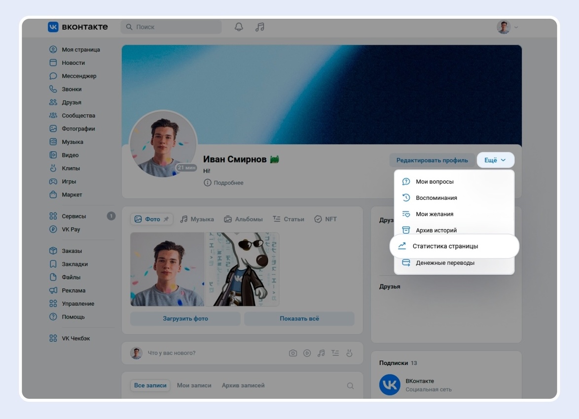 Чтобы посмотреть статистику, перейдите в свой профиль, нажмите Ещё и выберите раздел Статистика страницы. Источник: vk.com