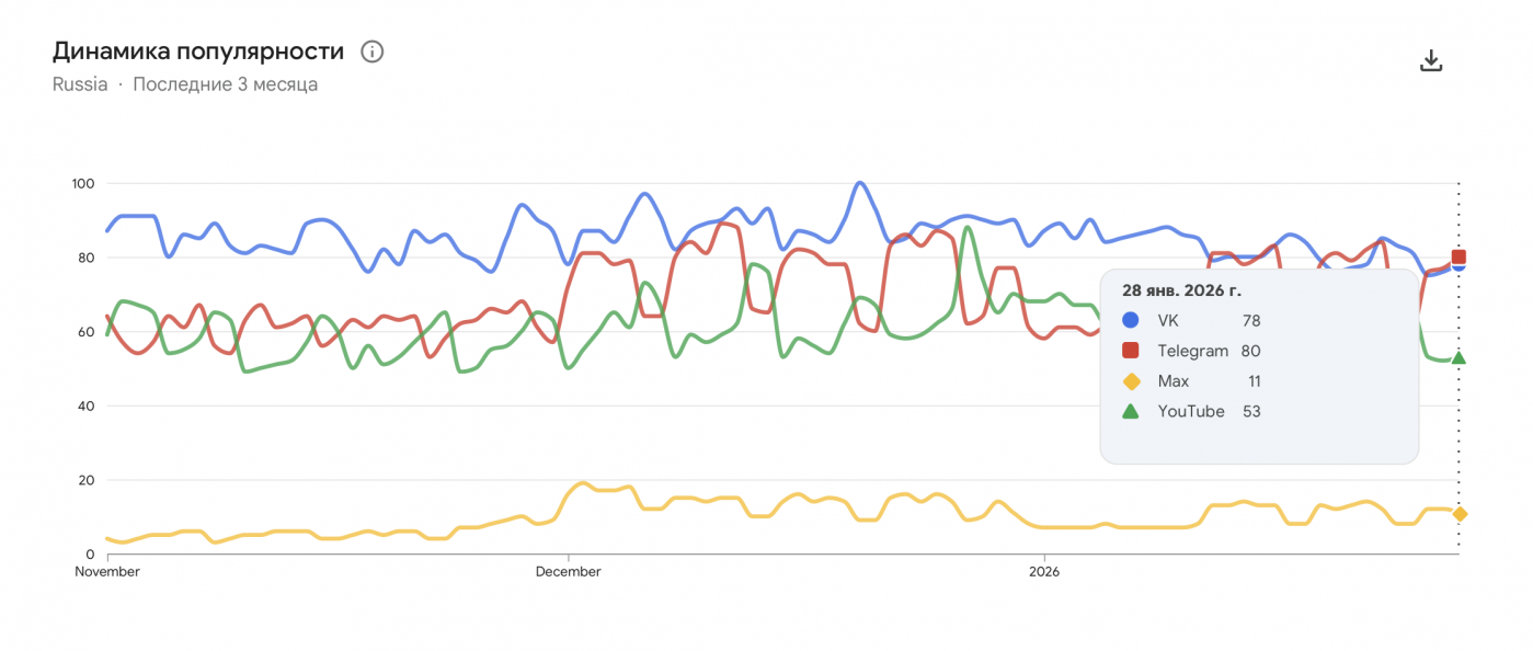 ВКонтакте остается самой популярной социальной сетью в России. По данным аналитического сервиса Google Trends, россияне ищут информацию об этой площадке чаще, чем о Телеграме, Ютубе и мессенджере MAX.