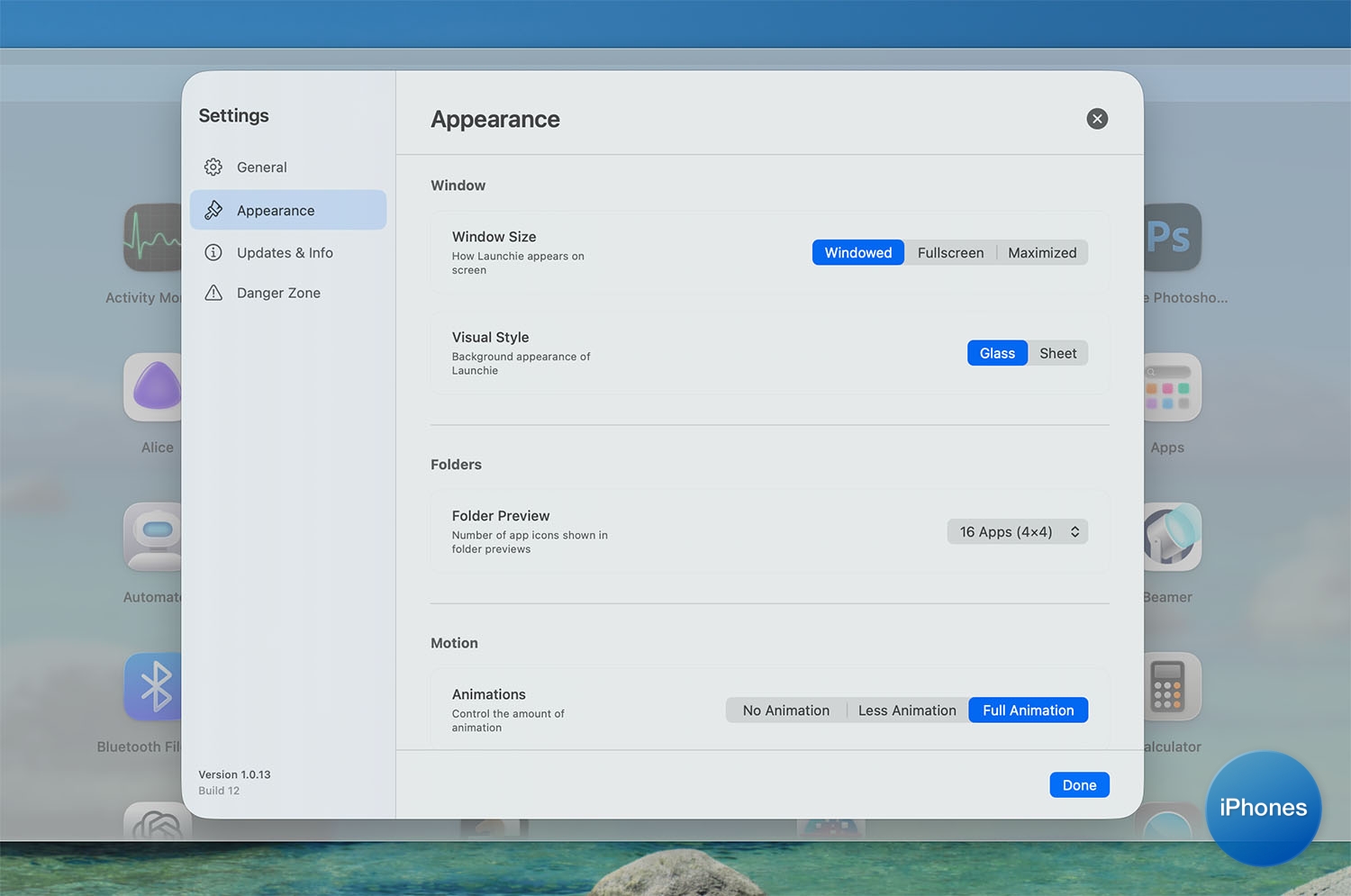 У приложения много настроек, можно сделать панель полноэкранной или в окне, отключить или ускорить анимацию, настроить поведение панели.