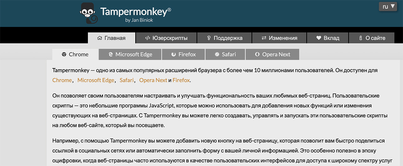 ▪️ Перейдите на сайт Tampermonkey или найдите его в магазине расширений вашего браузера