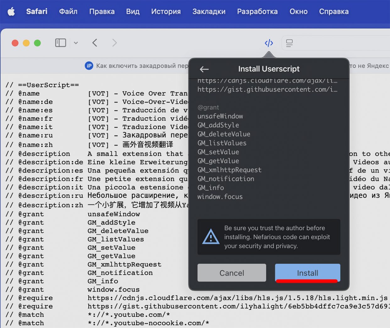 ▪️ Если пользуетесь Safari, то после нажатия «Установить Скрипт» откроется окно с кодом. Нужно нажать на значок Developer Tools рядом со строкой поиска, выбрать кнопку «разрешать всегда на каждом сайте», затем в этом же окне промотайте код вниз и нажать Install.