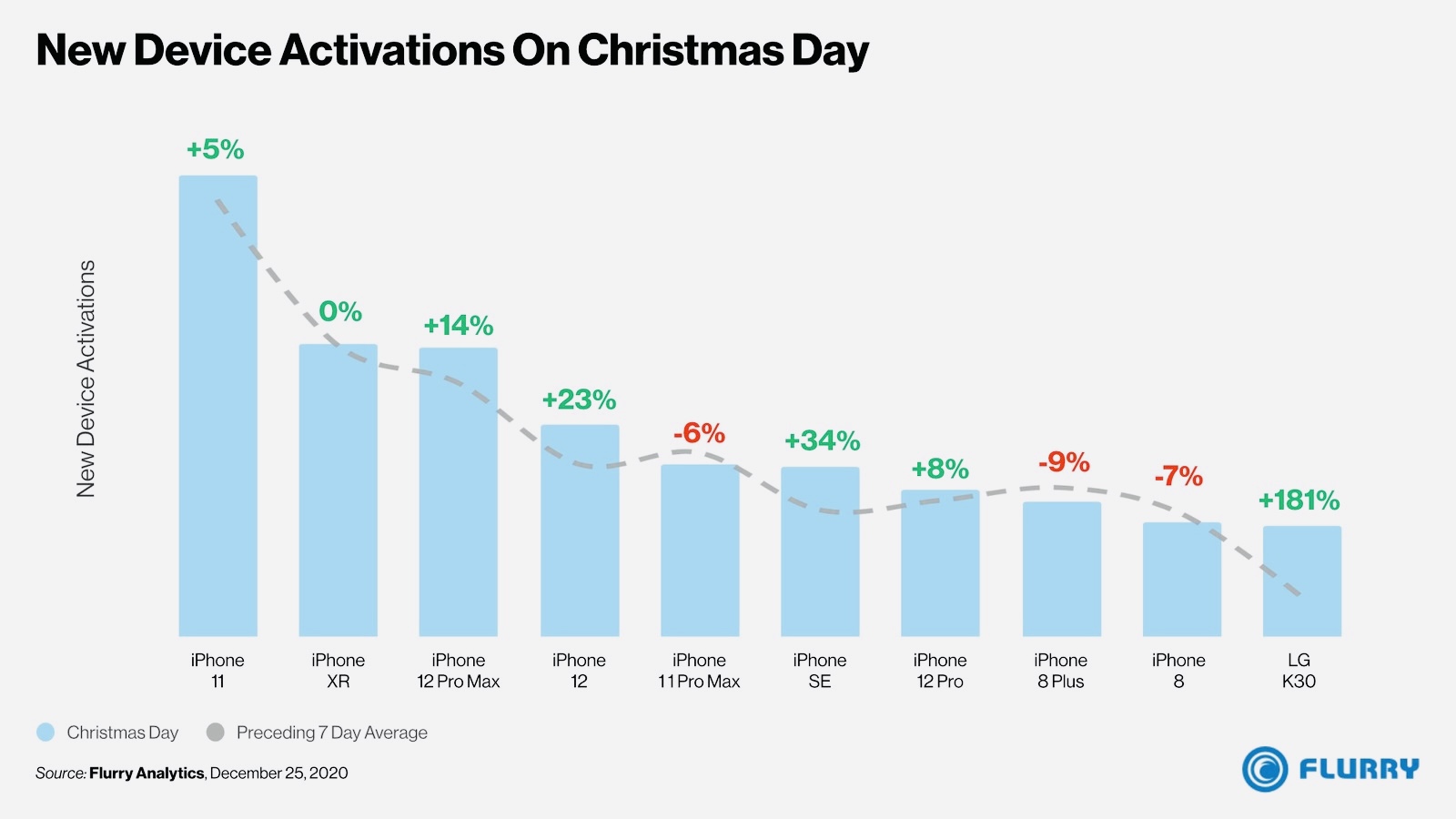 A new report by Flurry Analytics states that nine of the top ten smartphones activated on Christmas Day 2020 in the United States were iPhones. Christmas Day in the United States is the single greatest day for new smartphone activations, so it represents a unique opportunity to analyse consumer preferences. The iPhone 11 was the most activated device on Christmas Day, with activations five percent higher than the trailing average of the period between December 18 and December 24.