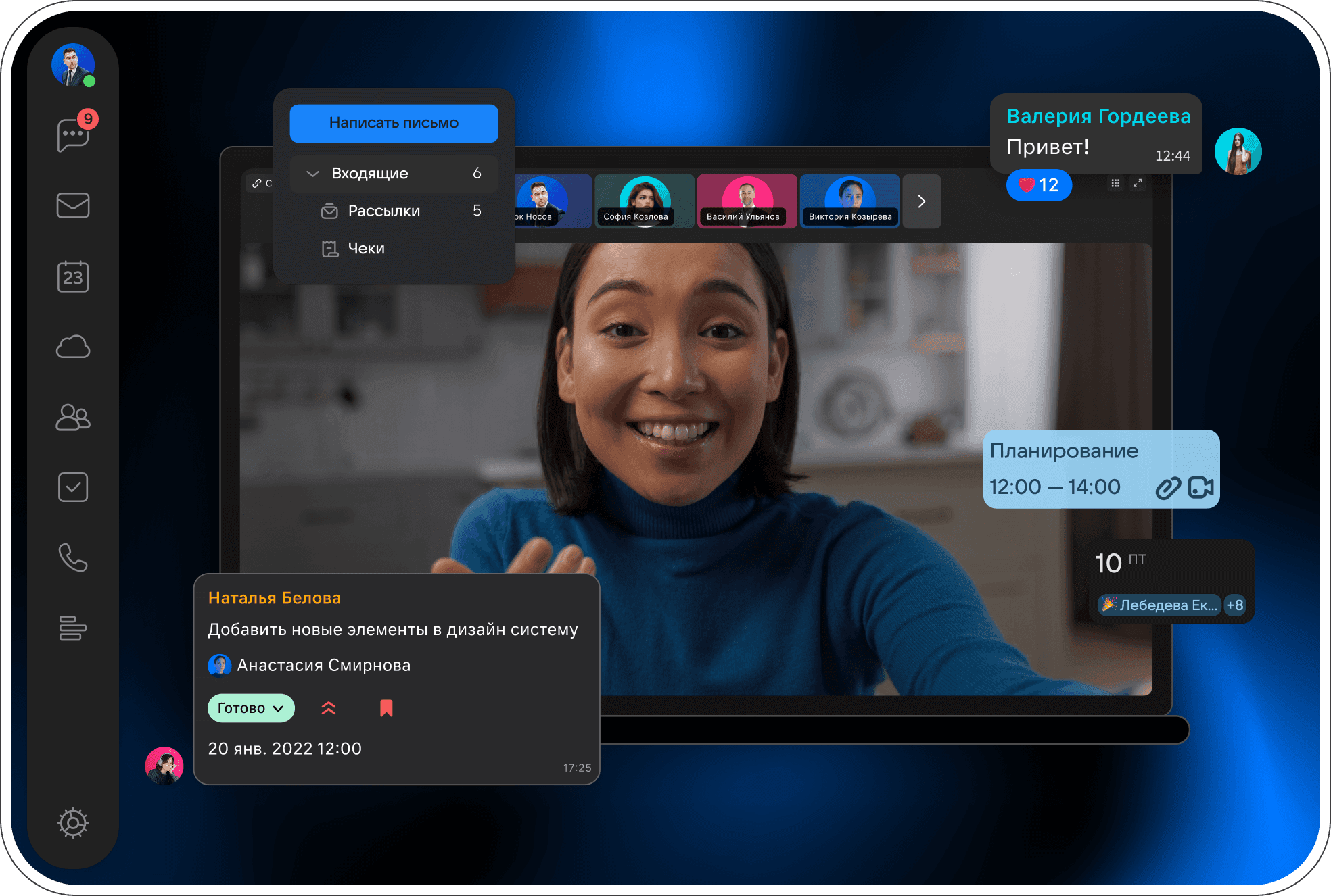 - Мессенджер, аудио и видеозвонки, каналы и группы. Вокруг — задачи, а у части клиентов ещё почта и календарь.