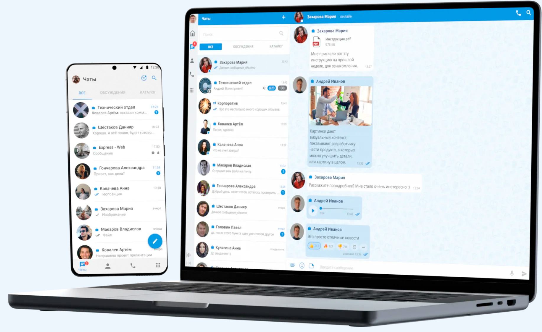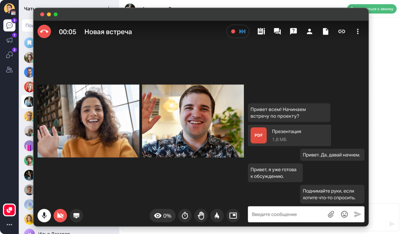 - Чаты, обмен файлами и быстрый переход к звонку и ВКС внутри одного решения.