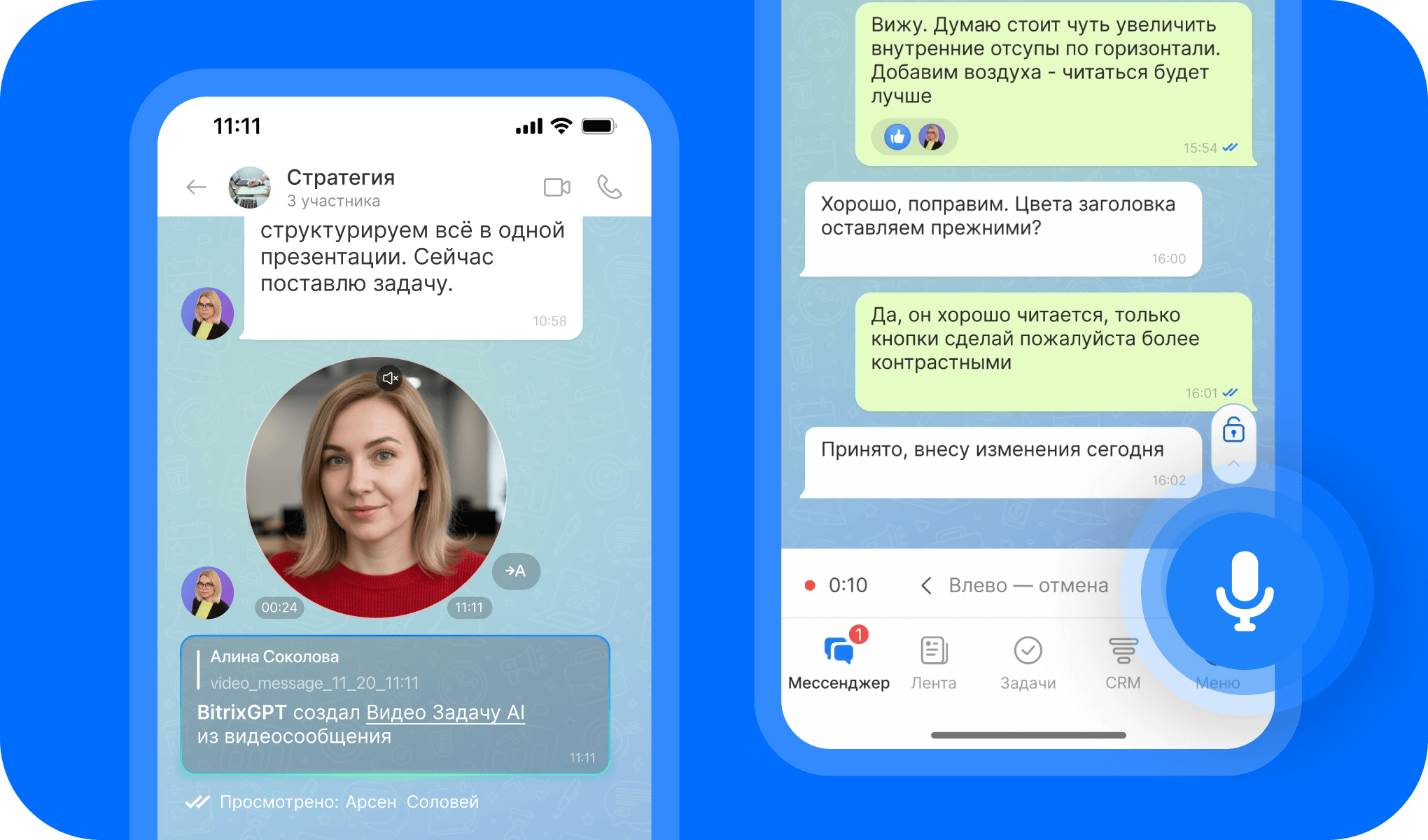 - ИИ-помощник может подводить итог длинного обсуждения, расшифровывать голосовые и видео в текст, предлагать оформить задачу по содержанию переписки.
