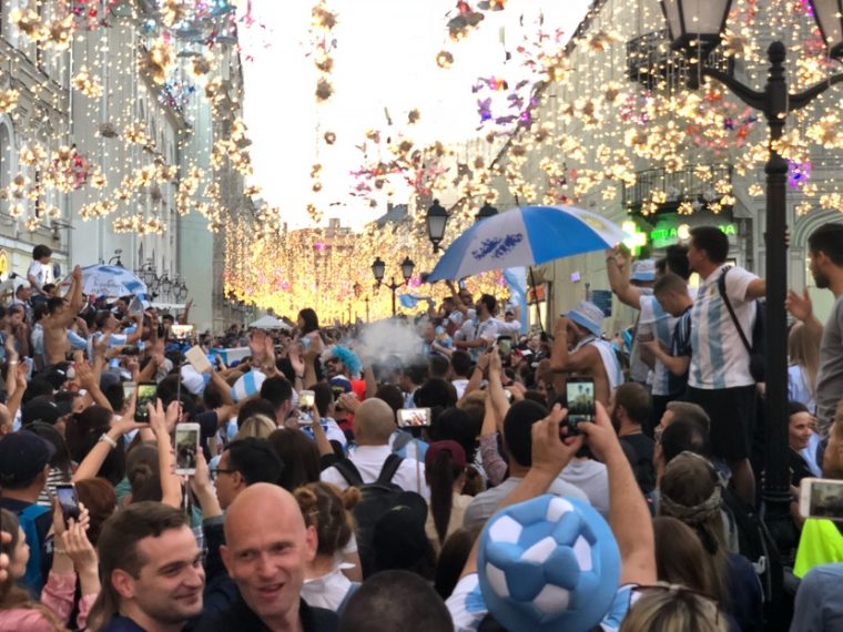 Атмосфера веселья и празднования здесь творится просто нереальная. И даже если вы не любите футбол, то шествие по Никольской точно вас должно зацепить. В Москве ещё никогда не было такой безумно приятной и позитивной атмосферы. Прямо на улице, рядом с домом.
