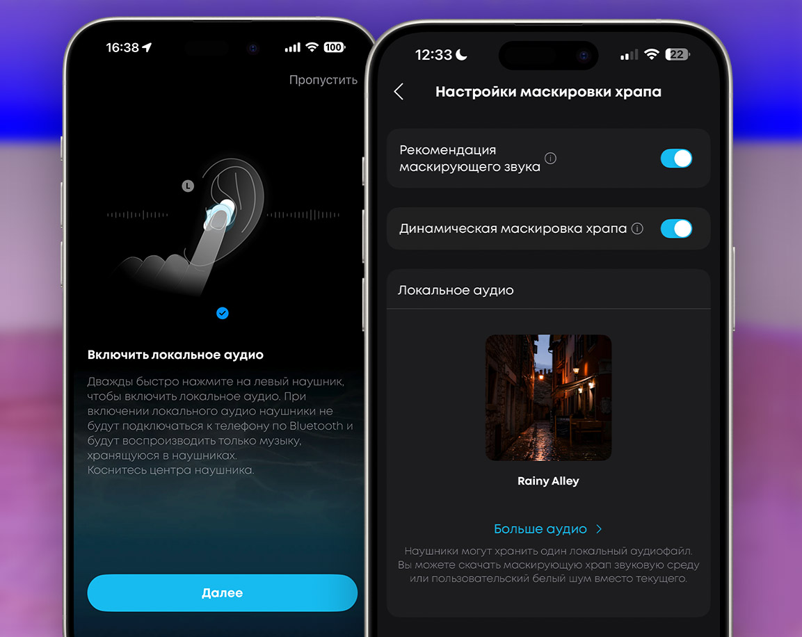 - Sleep-режим: воспроизведение встроенных звуков из памяти наушников, смартфон можно вообще выключить
