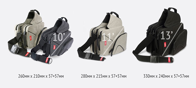 На иллюстрации выше я решил показать разницу в размерах трех моделей сумок MIXBAG (внизу указаны внутренние размеры, что дает понять какие вещи туда поместятся). Крайние слева — модель первого поколения, активно мной использовавшаяся и до сих пор частенько выступающая в качестве основной клади в городском цикле, если с собой не надо брать ноутбук.