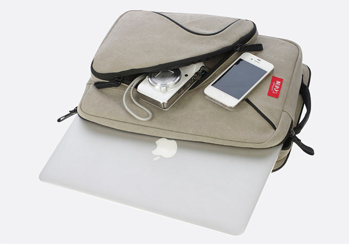 Себе для повседневной эксплуатации я выбрал именно черную модель по двум причинам. Основная — в ней можно свободно разместить 11,6-дюймовый MacBook Air в чехле. В более компактную модель он нормально входит только без чехла и при этом сидит внутри очень плотно. С одной стороны, это хорошо — ноутбук не болтается. С другой — сумка буквально натягивается и уже не удастся набросать в основной отдел какие-то мелочи. Хотя, это не проблема если использовать всю сумку в сборе и одну половинку выделить только под ноутбук.