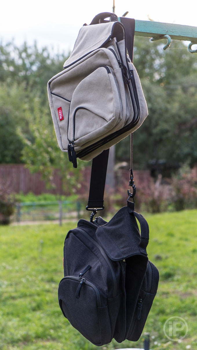 Лично я не ношу сумку просто перебросив обе половинки через плечо, хотя увеличенные габариты хуже такой опыт не сделали. Пробовал — нормально и нужные вещи доставать удобно.