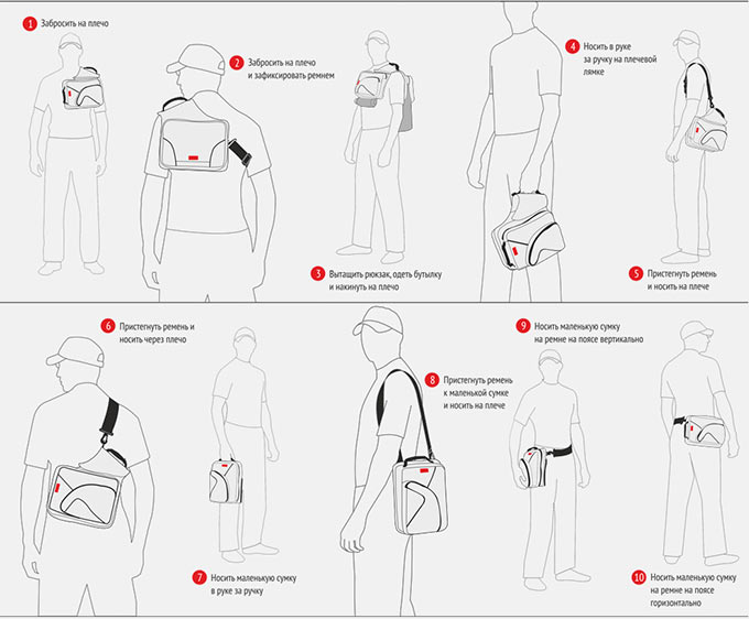 Еще одной отличительной особенностью этой сумки является многообразие способов ее эксплуатации. На иллюстрации ниже их десять, но думаю, что адаптируя сумку под себя, можно с легкостью придумать еще пару, как минимум.
