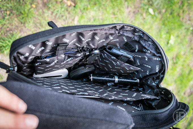 Хотя, если внутрь ноутбук не класть, то в основном отделе будет тоже масса полезного пространства. Плюс на стенке сохранилась пара кармашков на липучке, в которых я ношу кошелек и смартфон, хотя они достаточно пухленькие и для массы других полезных вещей.