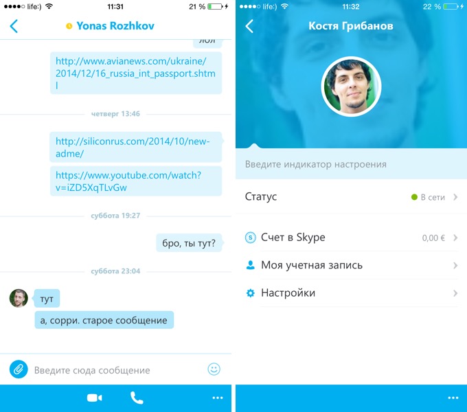 Весь интерфейс приложения Skype для iPhone напоминает новую версию программы для компьютеров. Перед глазами список последних чатов, внизу кнопки нового чата и набора номера, есть эффектный переход между разговорами, контактами и списком избранных с помощью свайпов влево-вправо. Собственно, всё неплохо, кроме того, что Skype в таком виде — чужеродная программа для iOS в таком виде, так как эксплуатирует идеи интерфейса приложений под Windows Phone. Привыкли к стандартным мессенджерам? Придется переучиваться ради Skype.