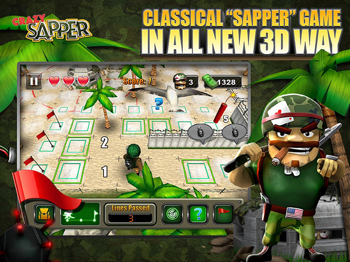 Первая игрушка [iTunes link] взяла за основу — не поверите! — старый добрый Microsoft Minesweeper или «Минёр», вот уже более десяти лет кочующий из одной версии Windows в другую в составе стандартного набора приложений. Фактически это Minesweeper на стероидах, выполненный в полном 3D и вы, наконец-таки узрите того самого «минёра», что миллионы раз подрывался на плоском бело-сером поле. Теперь это бравый солдат, которому предстоит пройти по полям и болотам, джунглям и пустыням. Принцип разминирования классический — по клеточкам и с помощью сопутствующих цифр, а вот реализация на совершенно новом уровне.