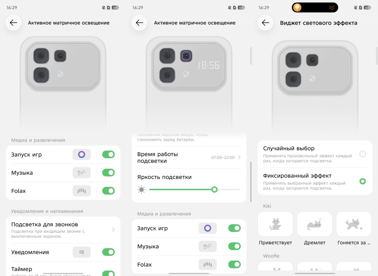 Active Matrix отображает анимированные глифы, которые можно настроить вручную, показывает время, проценты аккумулятора во время зарядки и даже поддерживает игры на базе гироскопа.