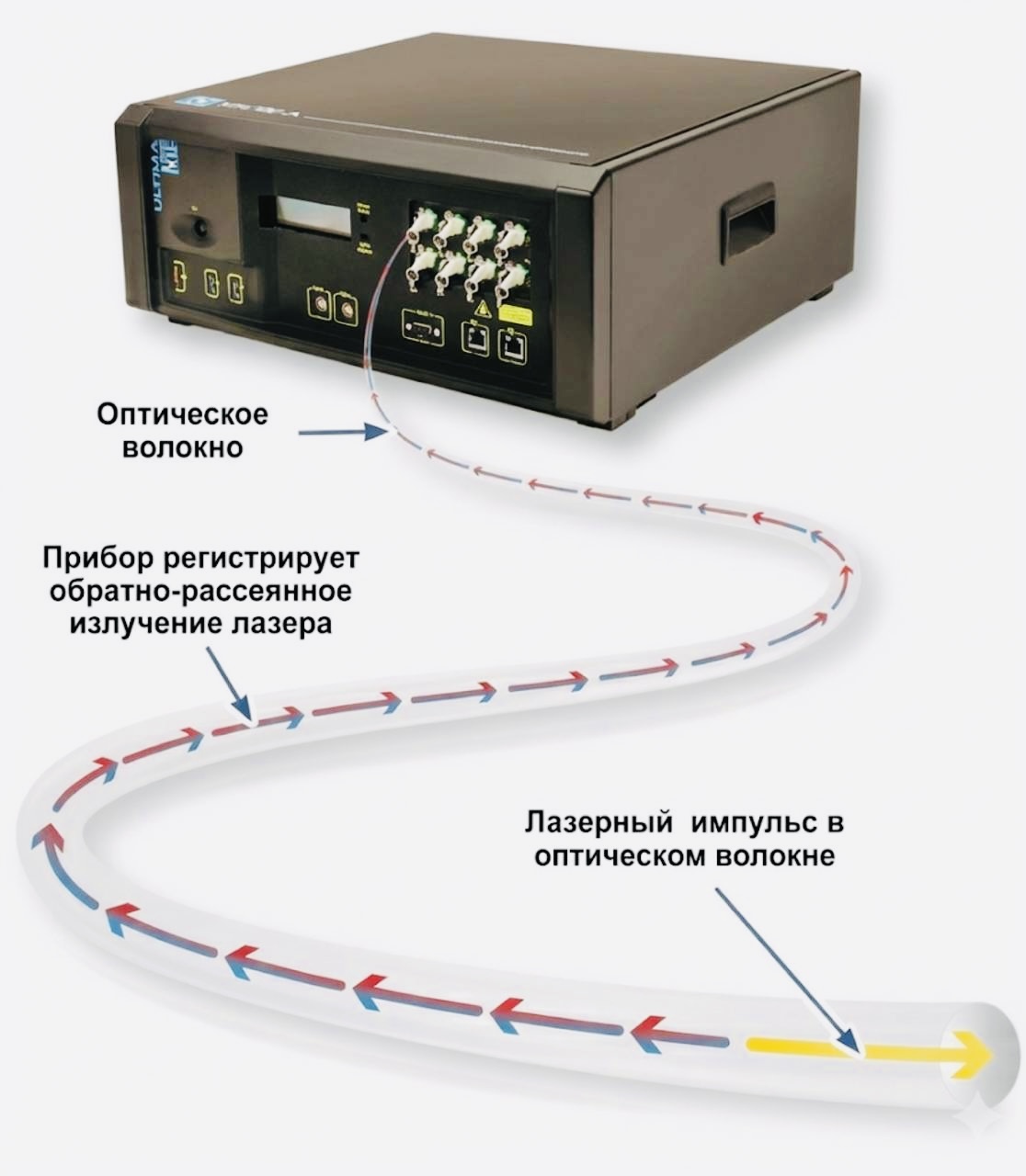 Технология основана на анализе световых импульсов внутри кабеля. Компактный когерентный рефлектометр посылает в волокно модулированный сигнал и фиксирует рассеянный свет. Любое воздействие (изменение температуры, вибрации, звук или натяжение) меняет характеристики импульса. Эти изменения считываются в виде цифровой рефлектограммы и анализируются алгоритмами обработки сигналов и ИИ.