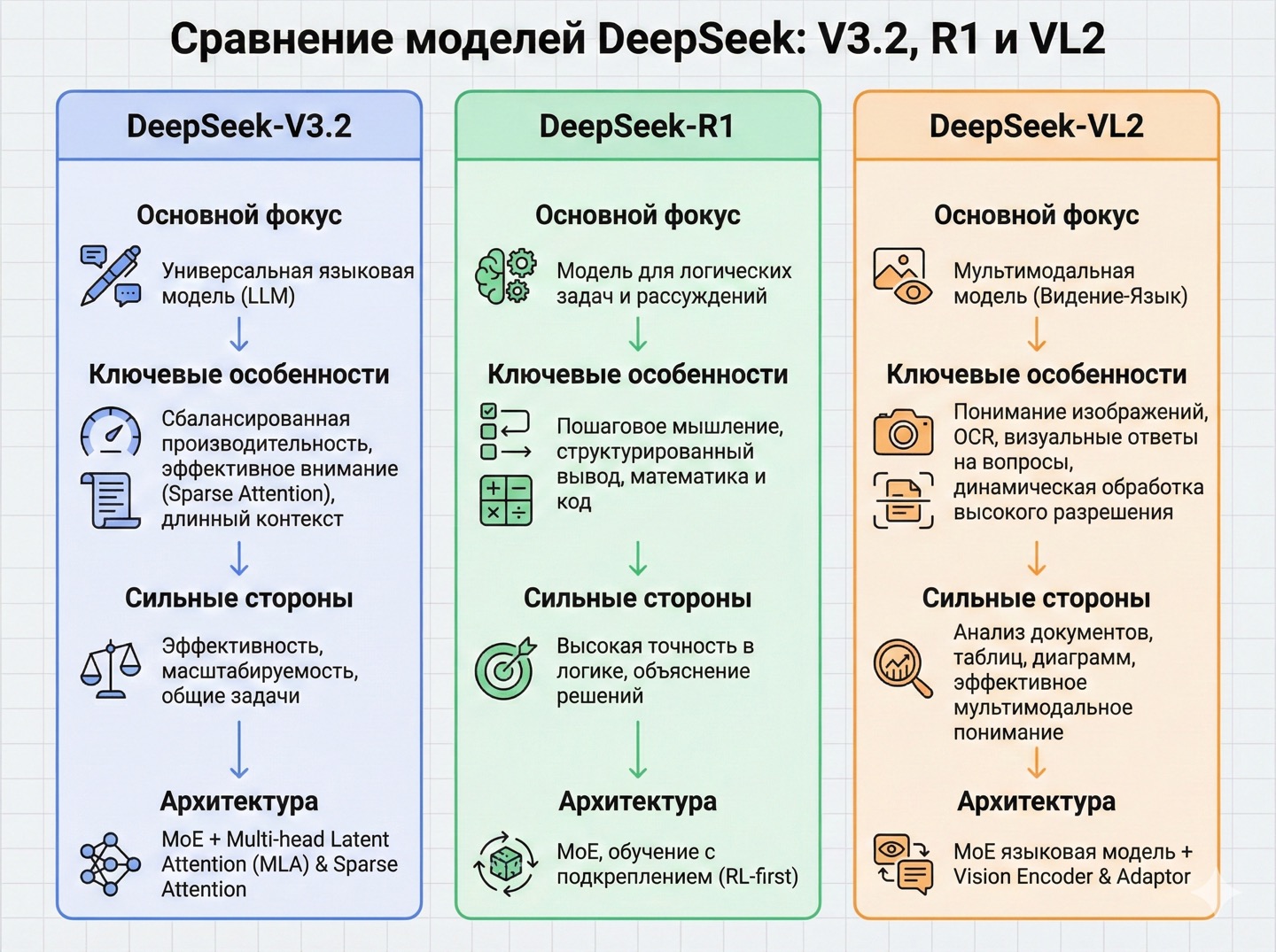 - DeepSeek-V3.2: стандартная модель для работы, оптимизированная под большие запросы и высокую скорость работы.