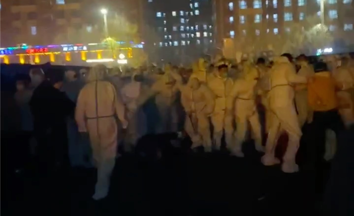 Рано утром в среду сотни сотрудников завода Foxconn в Чжэнчжоу покинули свои общежития и попытались прорваться через охранников (они одеты в белую форму).