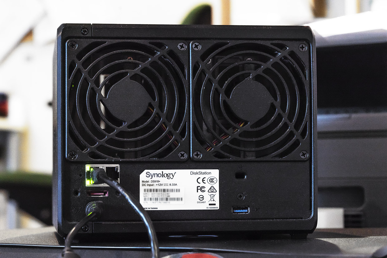DS918+ подключается к сети по кабелю Ethernet через гигабитный порт, которых здесь два.