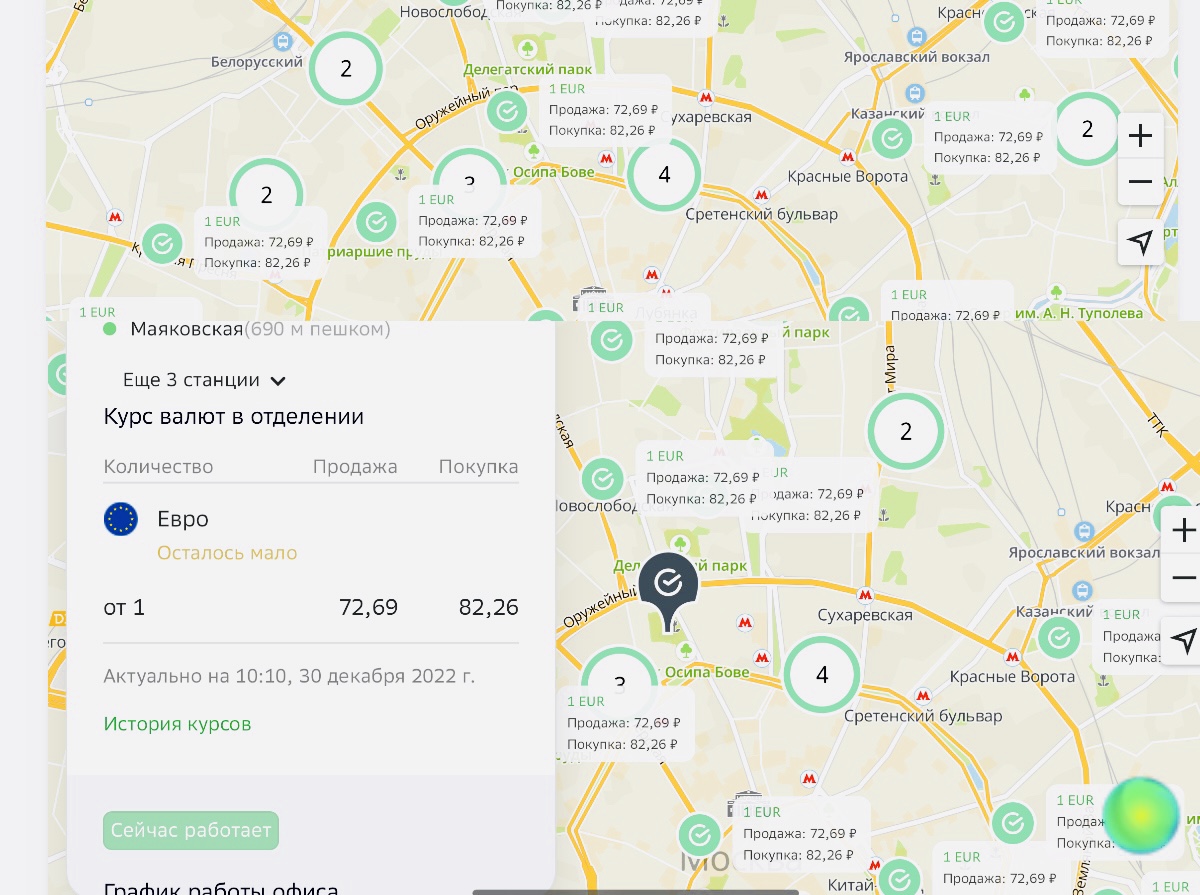 Для этого нужно в специальном разделе выбрать требующуюся валюту (например, доллар, евро или юань), удобный офис и нажать на него, чтобы получить расширенную информацию. Там же отображается актуальный курс. Данные постоянно обновляются.