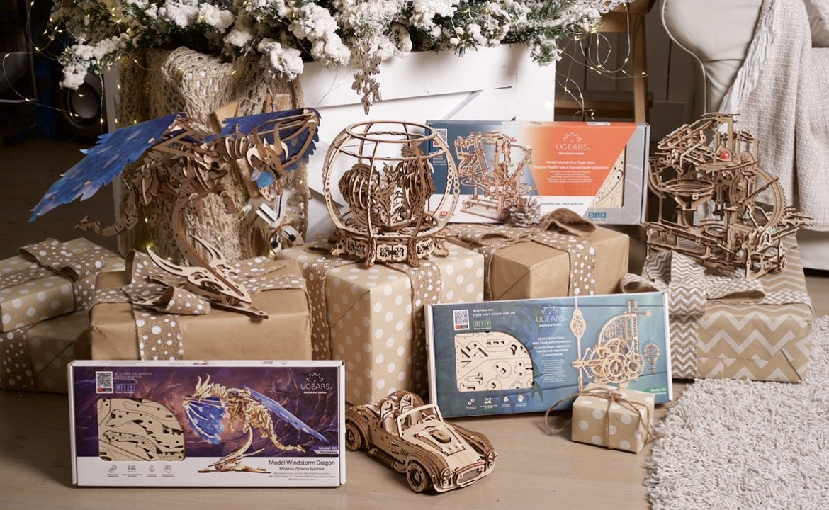 Ugears около 7 лет выпускает качественные комплекты для сборки деревянных поездов, машинок, сейфов, мотоциклов, игрушек и разных декораций, вроде фабрики по производству роботов.