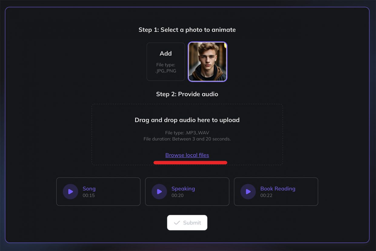4.Нажимаете Browse local files и выберите голосовой аудиофайл. Можно взять любой отрывок из фильма, или записать на диктофон свою речь, продолжительностью до 20 секунд. Можно использовать фрагмент песни – тут уж всё зависит от вашей фантазии.