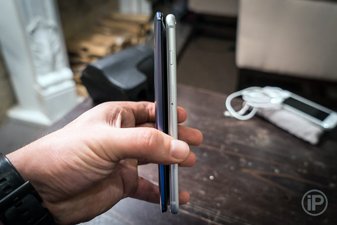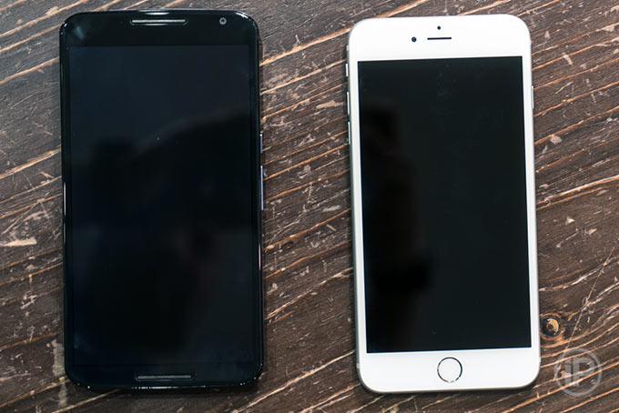 «Гуглофон» буквально на несколько миллиметров шире, но при этом обладает более крупным в диагонали дисплеем, причем крупнее он на внушительные 12,7 мм. И вот тут можно воскликнуть, мол, Nexus 6 толстый, а на фоне iPhone 6 Plus выглядит как-то так: